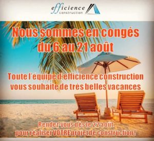 Vacances d’été – fermeture du 06 au 21 Août 2022 Nous vous souhaitons de Bonnes et belles vacances à tous et toutes. Rendez-vous le 22 Août pour réaliser votre projet de construction En attendant, prenez soin de vous et des vôtres